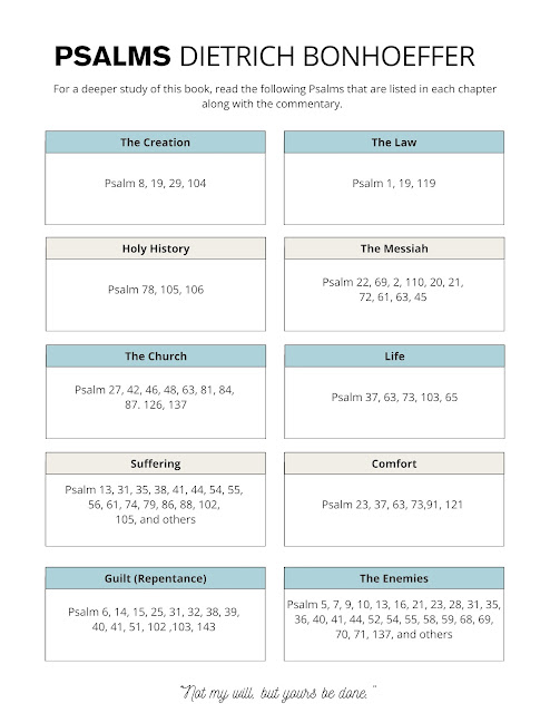 The book gives a great breakdown of the content of the Psalms and how they are used in prayer. If I were to read this book again, I would have taken it slower and read through the Psalms and then the commentary regarding the topic. I’ve created a printable that breaks down the Psalms referenced in each chapter for those wanting a deeper dive. Download printable HERE.